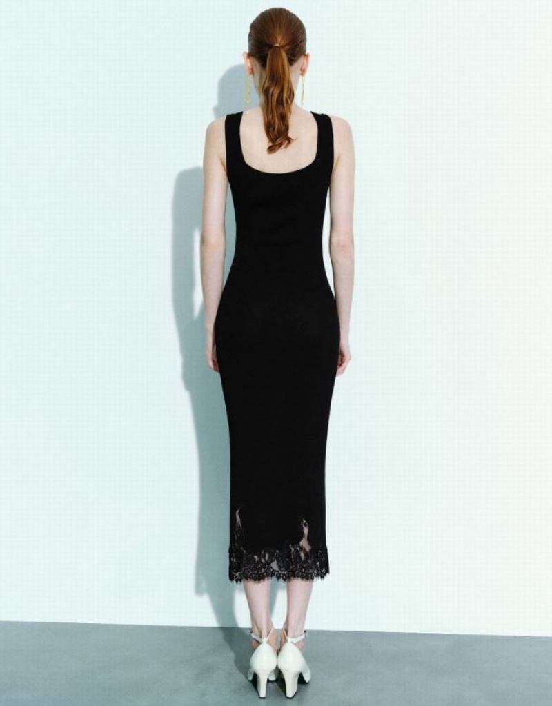 Black Urban Revivo Sleeveless Lace Hem Women\'s Knitted Dress | 65041WSQF