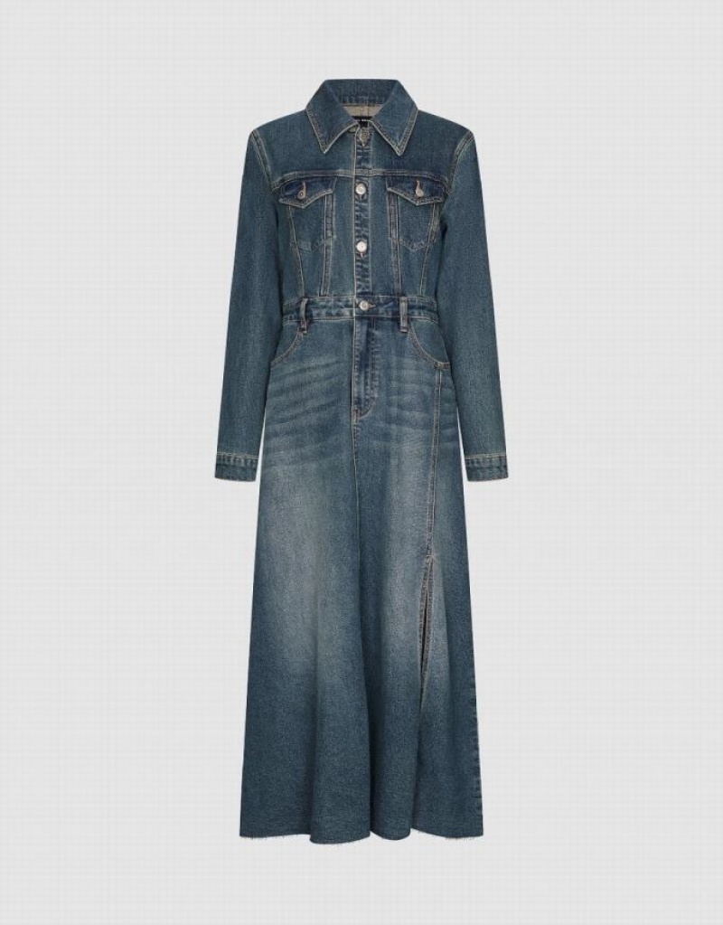 Blue Urban Revivo Split Hem Lapel Women\'s Denim Dress | 54123VUNO
