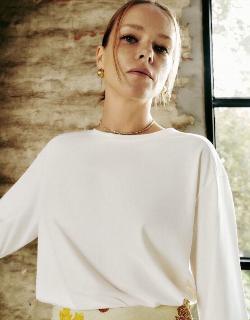 White Urban Revivo Crew Neck Loose Women\'s T-Shirts | 04139GFAQ