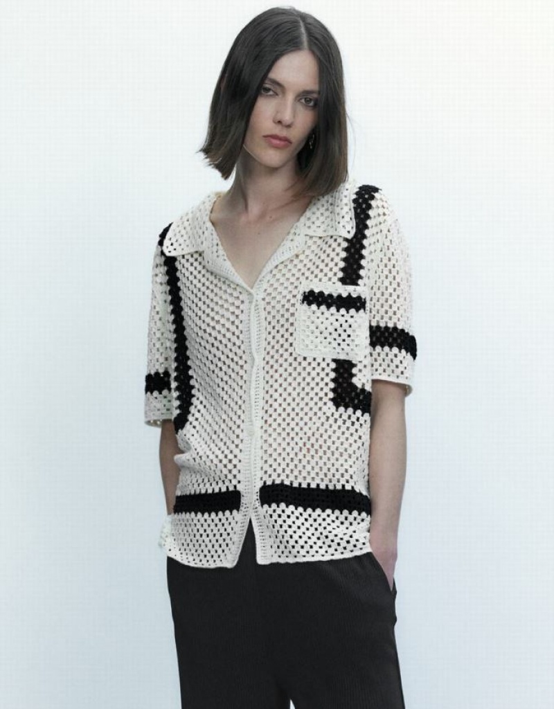 White Urban Revivo Pointelle Lapel Knitted Women\'s Cardigan | 58193NMXJ